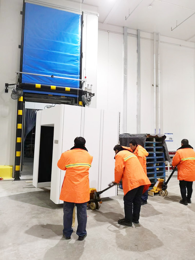 康平冷庫(kù)無(wú)霜空氣隔離系統(tǒng),增加了生產(chǎn)線傳送帶和冷庫(kù)保溫門一體化模塊