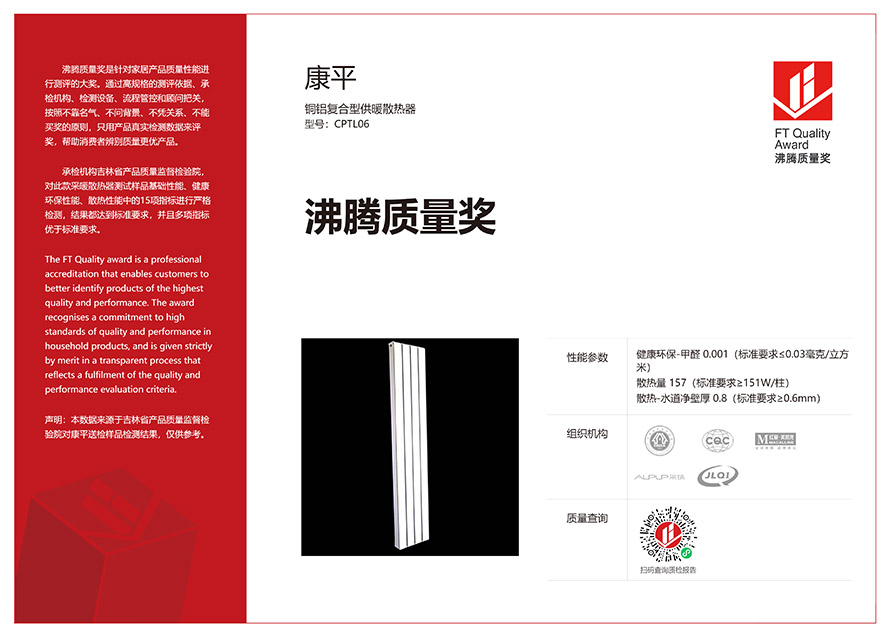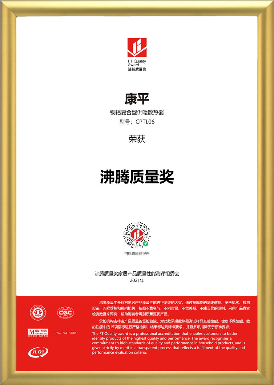 康平銅鋁復(fù)合散熱器產(chǎn)品榮獲沸騰質(zhì)量獎。同時,也進(jìn)入沸騰質(zhì)量金獎的評定范圍內(nèi)。