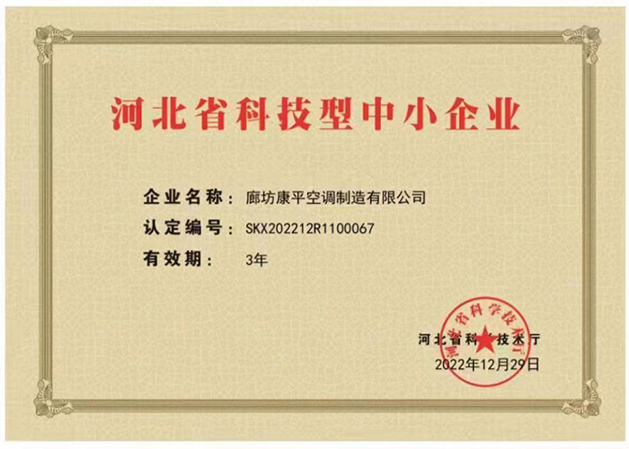 經(jīng)過(guò)嚴(yán)格執(zhí)行評(píng)價(jià)標(biāo)準(zhǔn)和流程,廊坊康平空調(diào)制造有限公司喜獲河北省科學(xué)技術(shù)廳頒發(fā)的“河北省科技型中小企業(yè)”榮譽(yù)認(rèn)定稱(chēng)號(hào),之前,康平空調(diào)已獲得“高新技術(shù)企業(yè)”認(rèn)定。