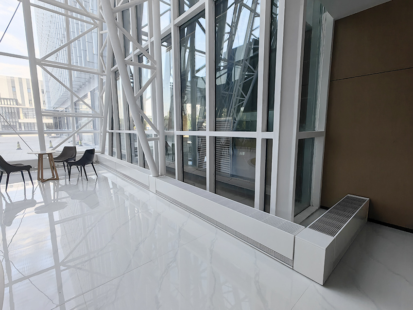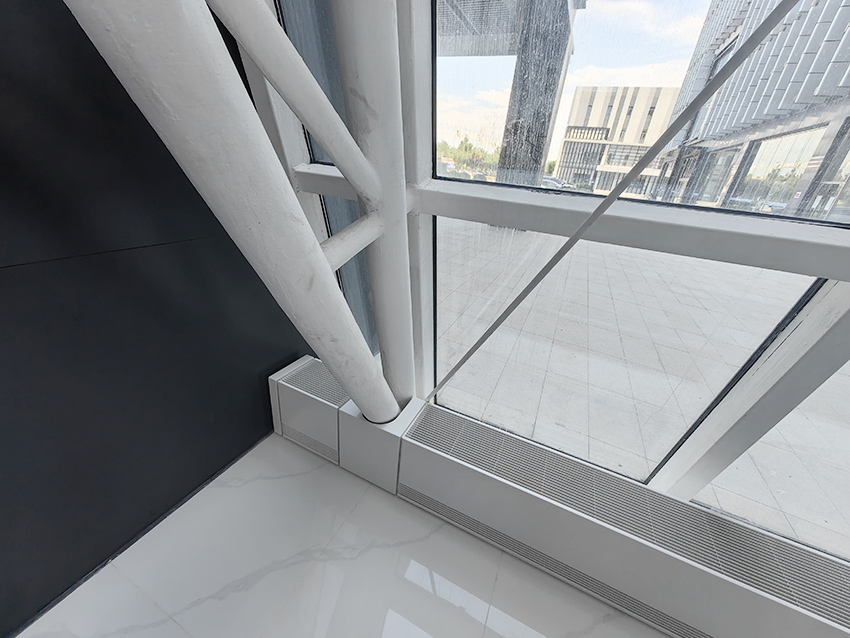 康平空調(diào)自主研發(fā)的可三維調(diào)節(jié)的幕墻對(duì)流散熱器制作工藝及安裝方法,通過(guò)U型卡槽微調(diào)裝置實(shí)現(xiàn)對(duì)流罩前面板、對(duì)流罩頂面板和分區(qū)隔板的水平面和垂直面上下、前后、左右三維調(diào)節(jié)定位,分區(qū)隔板和幕墻散熱器模塊之間留出5-15mm縫隙,補(bǔ)償幕墻長(zhǎng)度的累計(jì)偏差,滿(mǎn)足了幕墻散熱器的安裝精度要求。
